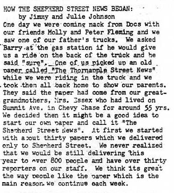 The young reporters had to get up early (6 AM in the case of The Leland Street Sunday News) to deliver the newspaper before the readers woke up. For elementary and middle school age children to wake up in the early morning, on a weekend, and deliver the newspaper says much about the sense of responsibility these children felt towards their readers. In addition to hand-delivering copies of the newspaper to the local community, all three newspapers sent copies to subscribers throughout the country (The Shepherd Street News charged extra for postage).